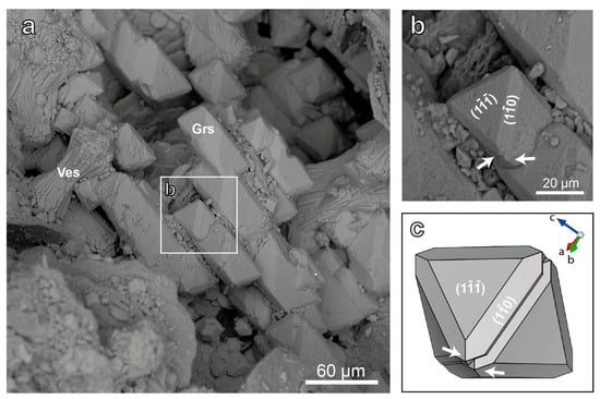 Fine-grained rodingite-like rocks are composed of minerals of the grossular–katoite series, chlorite, and diopside with an admixture of minerals of the kaolinite–serpentine and vesuvianite group, large, up to 2–3 cm, crystals of “Werner’s” grossular with epitaxial overgrowths of “achtarandite” (Figure 1b) [45]. The “achtarandite” pseudomorphs has a sponge structure built by the three-dimensional framework of flattened grossular–katoite aggregates [46]. The aggregates are represented by an overgrowth of octahedral and rhombic dodecahedral hydrogarnet crystals and splitting Si-deficient, (H4O4)4–-substituted, B-bearing vesuvianite crystals [17,19] (Figure 1c). The octahedral morphology is characteristic only for microcrystals of relatively strongly hydrated garnet [34]. The (pseudo)prismatic garnet crystals often grow on the hydrogrossular plates (Figure 1d,e). The morphology of prismatic hydrogarnet crystals indicates that these crystals can be elongated along the twofold axis in the [110] direction or along the fourfold axis in the [001] direction of the crystal [34]. A cross section of these pseudo-prismatic crystals changes from rhombic to quadratic. A prismatic hydrogarnet crystal 0.14 × 0.02 × 0.02 mm in size elongated along [111] with a quadratic cross section was used for the structural investigation (Figure 1f).