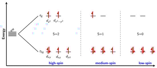 In a perfect octahedron (with the perfect local Oh point group symmetry), d-orbitals split into two levels, three t2g which are lower in energy and two eg levels which are higher in energy. Electron configuration of nickel in formal oxidation state +4 is d6. An orbital diagram of splitting is shown in Figure 3. There are three possible electron configurations. High spin, with four unpaired electrons (S = 2), “medium” spin configuration with two unpaired electrons (S=1) and low spin configuration, where all the electrons are paired (S = 0). The perfect calculated magnetic moments would therefore be 4, 2, and 0 for each of the possible configurations, respectively. From experience with the nickel fluorides, it can be expected (except for the low spin configuration) to see slightly smaller values than formally assigned (for example for NiF2 with two unpaired electrons the calculated value of magnetic moment is around 1.8 [9]).