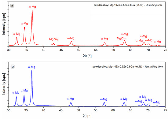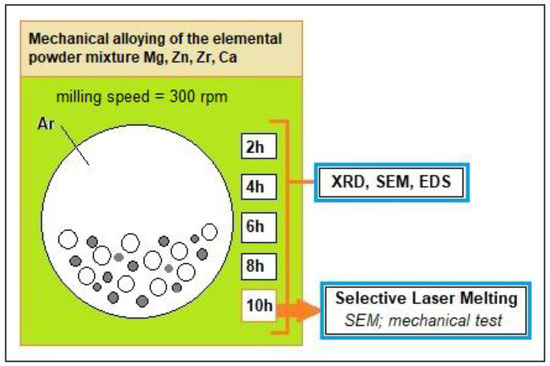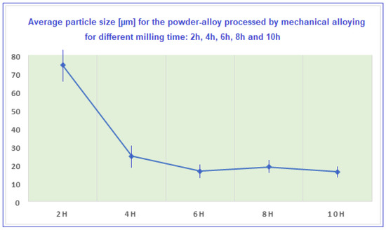 - The mechanical alloying method was applied to obtain the Mg-10Zn-0.5Zr-0.8Ca powder-alloy using different milling times. The morphologies of the milled powders reveal that the particles dimensions vary, with the average values ranging from 74.6 µm (after 2 h of milling process) to 16.2 µm (after 10 h of milling process).