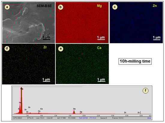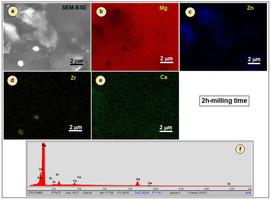 - It can be concluded that mechanical alloying has utility for achieving homogeneity of the alloy and microstructure refinement which is desirable for enhancing the alloy’s performances. However, the alloying chemical elements—Zn, Zr, and Ca—introduced in the Mg-based solid solution and possible local variations in the composition can create a distribution of d-spacing for the crystallographic plane, which conducts to a value of 0.236% for the lattice strain; in the studied case, it is presumed to be produced by residual stresses, dislocations, and any other defect that causes a nonuniform lattice distortion in the crystal.