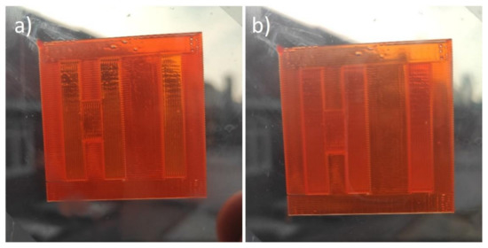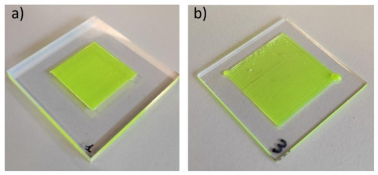 Photographs of printed squares of the LC oligomer containing 0.05 wt% K160 on (a) PMMA and (b) glass.