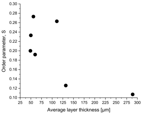 Derived order parameter, S, as a function of the thickness of the deposited layer for 0.05 wt% K160 deposited on PMMA.