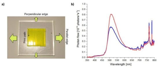The emission power output was recorded for each of the four edges of the samples. If the deposition direction of the DIW deposition is primarily parallel to the entry port of the integrating sphere it is called “parallel edge”, while if it is perpendicular to the entry port it is called “perpendicular edge”, similar to the earlier definition (see Figure 3a) [18]. Representative spectra obtained from the two edges for one DIW sample are shown in Figure 3b. The edge emission data and calculated internal efficiencies may be found in Table S1 in the Supplementary Materials.