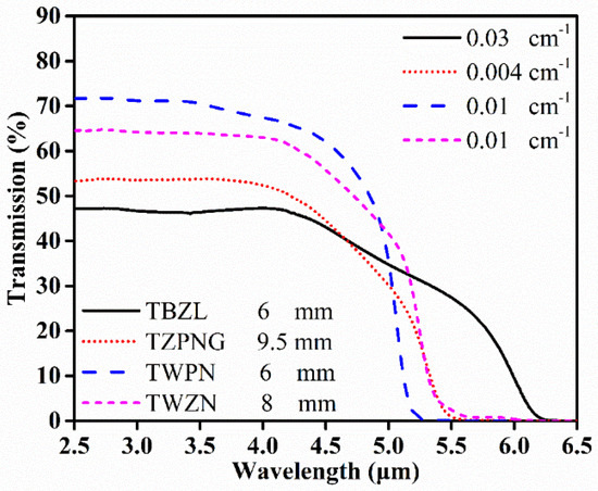 A Nicolet 6700 series Fourier transform infrared (FTIR) spectrometer was used to measure the infrared transmission spectrums of the fluorotellurite glasses, and the dehydration effects of fluoride are shown in Figure 1. The data on the upper right of the figure is the OH absorption coefficients which were calculated according to [26], and the data on the lower left is the thickness of the fluorotellurite glasses for testing. The results show that TBZL glass has the widest infrared transmission range, but its OH absorption coefficient is 0.03 cm−1. Dehydration of the TBZL glass is poorer than other fluorotellurite glasses because the proportion of fluoride in its composition is only 1.5%mol. The molar percentages of fluoride in the compositions of TWZN, TWPN, and TZPNG glasses are 5%, 3%, and 10%, and the corresponding OH absorption coefficients are 0.01 cm−1, 0.01 cm−1, and 0.004 cm−1, respectively. These results show that the fluoride content in the glass significantly affects the OH content of the glass, and the above−mentioned fluorotellurite glass can be applied in the mid−infrared range. In addition, when the fluorotellurite glass composition is designed, it is necessary to dope as much fluoride as possible to eliminate the OH of the glass, and at the same time, the thermal stability of the glass should meet the requirement for fiber drawing.