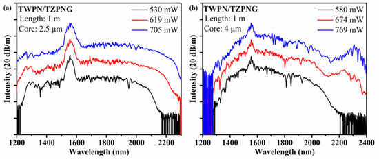 The step−index fluorotellurite fibers were pumped by a 1560 nm fs fiber laser (Carmel Model CLF−10CFF, Carmel, CA, USA) with a pulse width of 88 fs, a repetition rate of 80 MHz, and maximum average power of 2.26 W. A mounted aspheric lens (Thorlabs, Newton, NJ, USA, C430TM−C) was used to couple the pump laser into the fluorotellurite fibers. The SC spectrums were detected by the spectrometers (Yokogawa, Tokyo, Japan) from 1200 nm to 2400 nm. TWPN/TZPNG fibers with core diameters of 2.5 μm and 4 μm and lengths of 1 m were used as nonlinear mediums to generate SC, and the spectrums are shown in Figure 4. Figure 4a shows that the broadening of the SC is symmetrical with the increase in the pump power, which indicates that the broadening mechanism of the SC is mainly dominated by SPM. When the power of the SC is 705 mW, the SC spectrum spans from 1200 nm to 2300 nm, and its flatness in the spectral range of 1200–2250 nm is 20 dB. Figure 4b shows that SC was generated in a TWPN/TZPNG fiber with a core diameter of 4 μm. The results show that the SC broadens asymmetrically with the increase in pump power, the blue−shifted components do not broaden, and the red−shifted components broaden with pump power increasing. The peak of red−shifted components shifts to longer wavelengths as power increases, which is attributed to Raman solitons. These results show that the TWPN/TZPNG fiber with a diameter of 4 μm has an anomalous dispersion region from 1500 nm to 2400 nm. The SC spectrums in the above two fibers clearly indicate the effect of core size on the dispersions of the fibers. Comparing the generation process of the SC in the above two fibers, it can be seen that when the core diameter of the fiber decreases from 4 μm to 2.5 μm, the SC spectrum changes from symmetrical broadening to asymmetrical broadening, which indicates that the TWPN/TZPNG fiber with a diameter of 2.5 μm is ANDi in the region from 1500 nm to 2300 nm. The SC results agree with the above−calculated dispersion results.