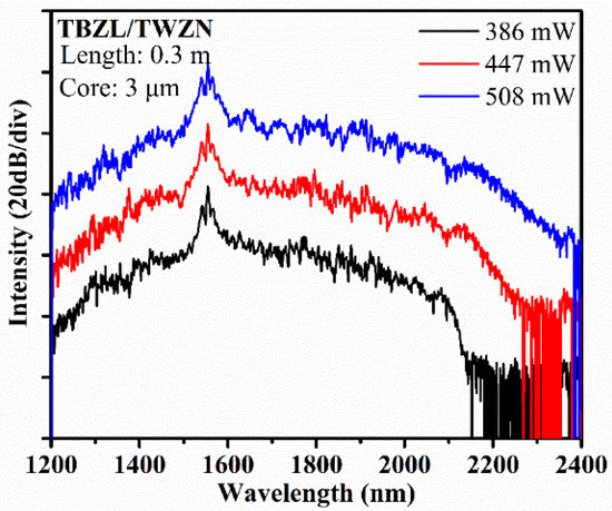 Dependence of the measured SC spectrum from 30 cm TBZL/TWZN fiber on the pumping power of a 1560 nm fs fiber laser.