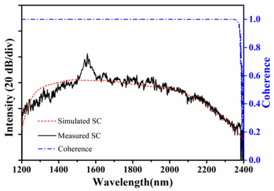 Figure 6 shows that the simulated SC result agrees with the experiment, and the coherence of the SC is 1 from 1200 nm to 2400 nm. These results indicate that a coherent SC spectrum expanding from 1200 nm to 2400 nm can be generated using an ANDi step−index fluorotellurite fiber. Moreover, these fibers are alternative candidates for highly coherent SC in the MIR region.