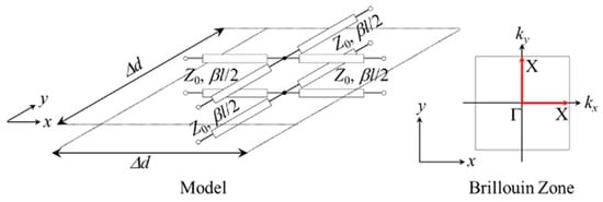 This can be obtained by defining a 4-port ABCD-matrix and solving the eigenvalue problem with Bloch–Floquet periodic boundary conditions [28,29,32]. kx and ky show the wavenumbers in the x and y directions, respectively. Additionally, the formulas for the dispersion characteristics along the Γ-X path, that is represented with the red arrows ((kx = k and ky = 0 or ky = k and kx = 0)), and the refractive index (n) can be written as: