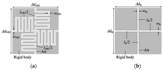 We constitute the NRI acoustic lens and the background medium with the unit cell structures in Figure 5a,b, respectively, and confirm the operation of the lens by a full-wave simulation in the next section.