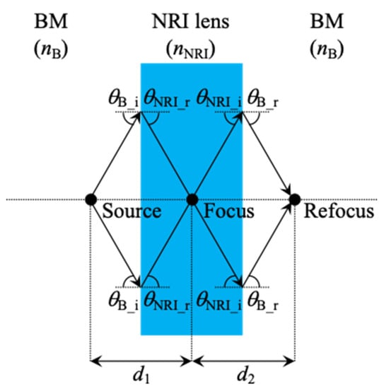 The concept of an NRI acoustic lens. |nNRI| = nB, θB_i = |θNRI_r| = θNRI_i = |θB_r|, d2 = d1 are assumed in this figure.