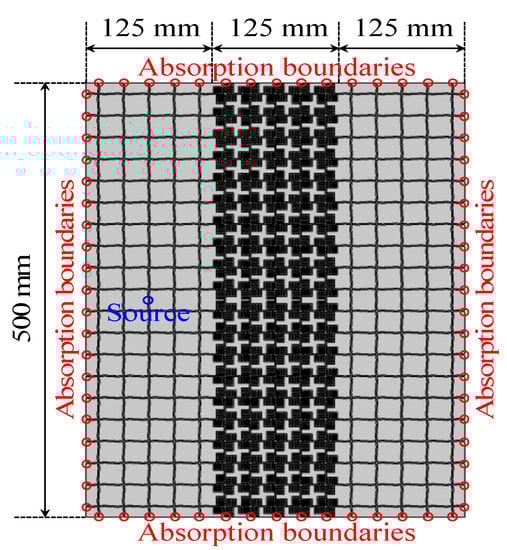 The setup for the full-wave simulation for the designed NRI acoustic lens (ΔdB = ΔdNRI = 25 mm). The size of the background medium and the lens are 20ΔdNRI × 5ΔdNRI = 500 mm × 125 mm, and are composed of the structures in Figure 5a,b, respectively. An acoustic wave source is placed at the position where it is separated by d1/2 = d2/2 = 2.5ΔdNRI = 62.5 mm from the lens.