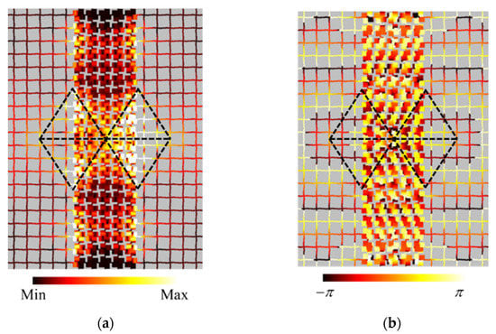 Figure 7a,b shows the calculation the amplitude and the phase distributions of the sound pressure, respectively, and the frequency is set to 2.5 kHz which is the operating frequency of the lens. The wavelength is λ = 3.92ΔdNRI = 98.0 mm and the broken line represents the typical theoretical trajectory of the incident acoustic wave from the source. The intersection of the line in the area of the designed NRI acoustic lens represents the theoretical position of the focus and that in the area of the right-hand side background medium represents the theoretical position of the refocus.