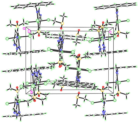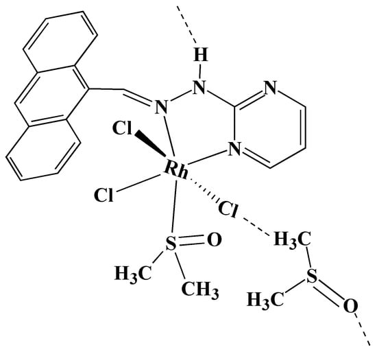 In view of the bond angles of one of the equatorial planes (N1, N3, S1, and Cl2) of the octahedron, there is an indication that the octahedral configuration is slightly distorted. As to the bond lengths and bond angles around the central Rh(III), it is found that the bond lengths of Rh1–N1 and Rh1–N3 are comparable with the reported bond lengths of Rh–N [14,15]. A packing diagram of this complex, together with the solvent DMSO, shows that there exist two types of hydrogen bonds, N–H···O and C–H···Cl, contributing to the construction of the crystal structure, which are formed between the Cl1 and C–H bond on the pyrimidine ring of 9-PMAH, the Cl3 and C–H bond on the methyl group of DMSO, and the O2 of DMSO and N–H bond of 9-PMAH (Figure 2). On the other hand, there also exist a series of π–π interactions between the neighboring anthracene rings of each 9-PMAH ligand, the shortest distance of which was measured to be 3.6442(13) Å by the Olex2 program, which is comparable to reported values [16,17]. The whole crystal structure was thus stabilized by these hydrogen bonds and π–π interactions, to form a three-dimensional supramolecular structure.