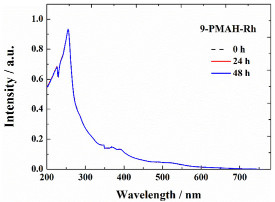 UV–Vis spectrum of 9-PMAH-Rh, showing its stability over 48 h in Tris buffer solution at room temperature.