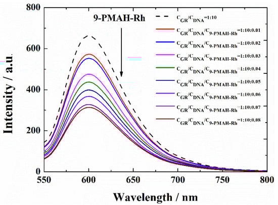 The working solution for the GR-DNA competitive experiment was prepared according to a concentration ratio of [GR]/[DNA] = 1:10, in which [GR] and [DNA] in the mixed solution were set to 1 × 10−5 and 1 × 10−4 mol·L−1, respectively. The Tris buffer solution was added to fix the volume of the working solution to be 3.0 mL. It was then stored in a refrigerator overnight to make sure that GR and DNA were fully bound. The stock solution of 9-PMAH-Rh (2 × 10−3 mol·L−1 in DMSO) was then added gradually into the working solution by a microinjector, to achieve the [GelRed]/[DNA]/[9-PMAH-Rh] ratio, step-to-step, from 1:10:0.01 to 1:10:0.08, where it reached a nearly saturated state. The fluorescence emission spectra of Ex (350 nm)/Em (590 nm) were recorded at the slit width of 5 nm/5 nm. For each step, the maximum fluorescence emission intensity was recorded, and the emission curve was saved, to form the GR-DNA complex competitive binding plot and calculate the quenching constant, Kq. Kq was obtained by a linear fit of plotting I0/I versus [Q], using the classic Stern–Volmer equation: I0/I = 1 + Kq × [Q], in which I0 and I refer to the maximum emission intensity of the GR-DNA system in the absence and presence of 9-PMAH-Rh, as both the quencher and competing binding agent, whereas [Q] is the concentration of the quencher.