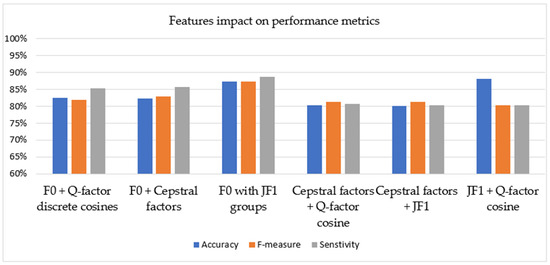 When the triple feature groups were used, model joining outperformed double joining. Among these joining, F0 +crystal shape factors + Q-factor discrete cosine joining obtained the best performance. This joining had a sensitivity value of more than 0.980, which proved the success of the discriminative classifier power. Although F0 + Q-factor cosine + JF1 and crystal shape factors + Q-factor cosine + JF1 models had the same accuracy and F-Measure scores, F0 + Q-factor cosine + JF1 was in the lead with a higher sensitivity rate. The joining of crystal shape factors + Q-factor cosine + JF1 had the least accuracy in all models.