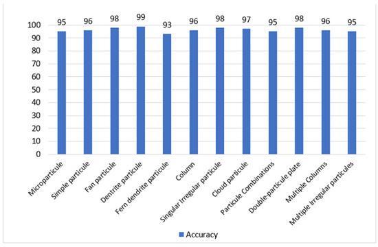 It can be deduced from the experimental results that the proposed model predicted more than 98% of the samples accurately. From Table 11, it can be concluded that the accuracy of the model increased if there were three features fusion present for the model training. The accuracy metrics of the model proved that it predicted most of the solid-states water crystals predictions correctly by showing a true positive rate of 0.95, on average. On the other hand, the model predicted 95% true negative predictions, on average. Moreover, from Figure 2 and Figure 3, it can be observed that the model predicted the different crystal structures more accurately, by 10% more, when we fused three features together than was the case for two fused features, thereby making the model’s concept of combining more features robust and precise. Finally, an F-measure of 93%, on average, proved that the proposed model retained high precision and recall. To validate our results, and offer a comprehensive analysis for evaluating the proposed model, see Figure 5. The distribution of the different class ids is depicted in Figure 6.