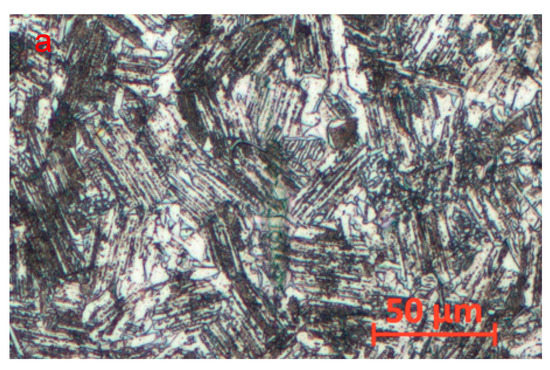 In this study, the nominal composition of the test material is Ti-45Al-4Nb-1Mo-0.15B (at.%). The electrode was made of a titanium sponge, high-purity Al, AlNb, AlMo and TiB2. Then, a round rod blank with a diameter of 18 mm was cast by two self-consuming melting processes and one induction smelting process. To eliminate shrinkage defects inside the casting, hot isostatic pressing (HIP) treatment was carried out at 1250 °C and 150 MPa for 4 h, followed by stress-relieving annealing treatment at 850 °C for 8 h. Figure 1 shows the microstructure of TiAl alloys under the optical microscopy (OM) and energy dispersive spectrum under scanning electron microscope. It can be seen from Figure 1a,b that the TiAl alloy has a typical three-phase structure. Among them, the brighter white area is -phase rich in Mo, while the -phase is darker gray, and both are equiaxed grains. The α2 lamellar colony are interspersed with small amounts of white β-phase and grey γ phase. Due to the presence of the β-phase, the grain size of the equiaxed grains is generally less than 20 μm, and that of the α2 lamellar colony is between 20 and 50 μm. The EDS elemental maps in Figure 1c show a uniform distribution and relative content of each element in the various phase structures.