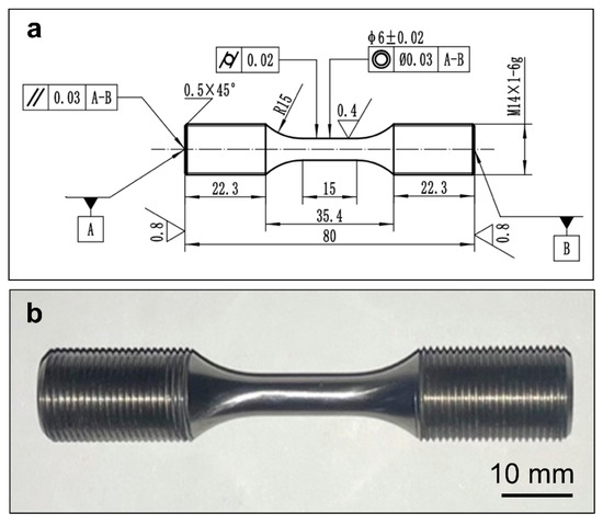 The round rod specimens with a 15 mm gauge section were used in the test clamped by a thread connection, as shown in Figure 2a,b. Considering the room-temperature brittleness of the TiAl alloy, the thread was machined by grinding. Longitudinal polishing was used for the final processing of the gauge section to reduce the impact of scratches on the low-cycle fatigue performance of the material.