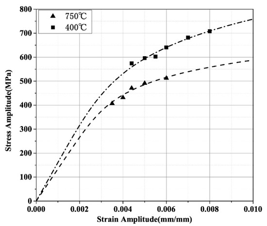where K′ is the strength coefficient, n′ is the strain hardening index, and E is Young’s modulus at the corresponding temperature. The material constants of the Ramberg–Osgood model for the TiAl alloy at 400 °C and 750 °C can be obtained by fitting the test results using the stable cycles at different strain amplitudes, as shown in Table 1. Figure 5 indicates that the simulation results of the cyclic stress–strain relationship based on the Ramberg–Osgood model are consistent well with the experimental results. According to the Ramberg–Osgood model, the corresponding stresses of the TiAl alloy at 400 °C and 750 °C at 0.2% plastic strain are 580 MPa and 495 MPa, respectively, which indicates that as the temperature increases, the toughness of the TiAl alloy is improved, while the strength of the material is significantly reduced.