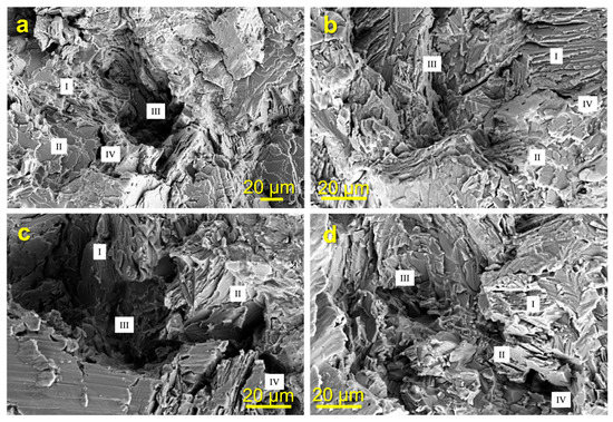 Fracture morphologies of fatigue specimens at 750 °C with the strain amplitude (a) 0.44% and (b) 0.6% and at 400 °C with the strain amplitude (c) 0.44% and (d) 0.6%, where I denotes the translemallar fracture, II denotes the interlemallar fracture, III denotes the transgranular fracture, and IV denotes the intergranular fracture.