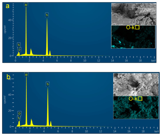The contents of the main elements in the fracture of the fatigue specimens obtained through the energy dispersive spectrometry (EDS) technology at different temperatures are shown in Table 3 and Figure 9. It can be seen that the oxygen content on the fracture surface at 750 °C is almost double that at 400 °C. The lifetime of the selected specimens demonstrates that this difference in the degree of oxidation could not be due to time rather than the temperature characteristics of the TiAl material.