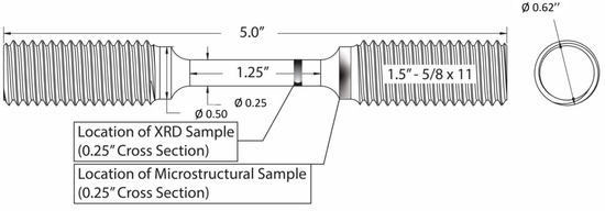 Eleven ASTM E8 standard tensile test specimens were machined from CPM® 3V 0.64″ diameter round stock in the annealed, unhardened condition. The tensile samples were cut to dimensions specified by ASTM E8 [18]: gauge diameter of 0.25″ and gauge length 1.25″ (e.g., ≥4 times the diameter; Figure 1). The ends of the samples were threaded with 5/8″ × 11 thread to facilitate the set up for the MTS Landmark tensile testing machine. SAE (Society of Automotive Engineers) Grade 8 bolts and couplers were used to secure the samples in the jaws of the tensile fixture to prevent the hardened CPM® 3V steel from deforming the jaws.