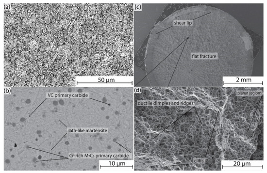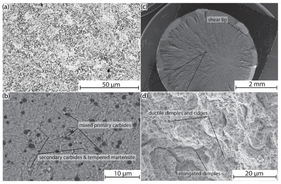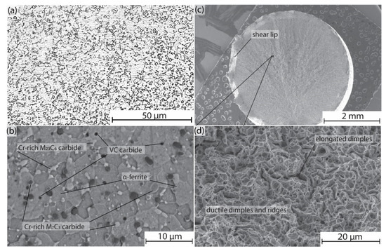 (a) Reflected light image of the 700 °C sample. Bright background textures contain tempered martensite which differs from the lath-like as-quenched martensite in the low temperature samples (Figure 3 and Figure 4). (b) Backscatter electron image highlighting the occurrence of tempered martensite and secondary carbides. (c) Wide-field secondary image of fracture surface highlighting shear lip. (d) Small-scale secondary electron image highlighting ductile dimples and ridges showing a ductile mode of failure.
