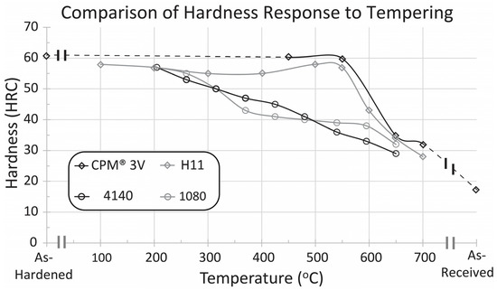 Comparison of HRC vs. tempering temperature response of CPM® 3V, H11, 4140, and 1080 steels. CPM® 3V hardness data is from this study; 1080, 4140, H11 hardness data is from [8].