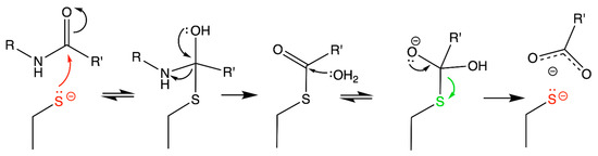 - Noda, L.H.; Kuby, S.A.; Lardy, H.A. Properties of thiolesters: Kinetics of hydrolysis in dilute aqueous media. J. Am. Chem. Soc. 1953, 75, 913–917. [Google Scholar] [CrossRef]