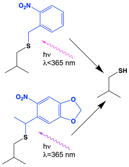 - Klan, P.; Solomek, T.; Bochet, C.G.; Blanc, A.; Givens, R.; Rubina, M.; Popik, V.; Kostikov, A.; Wirz, J. Photoremovable protecting groups in chemistry and biology: Reaction mechanisms and efficacy. Chem. Rev. 2013, 113, 119–191. [Google Scholar] [CrossRef]