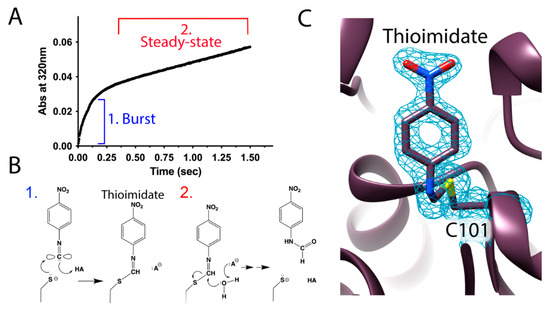 - Lakshminarasimhan, M.; Madzelan, P.; Nan, R.; Milkovic, N.M.; Wilson, M.A. Evolution of new enzymatic function by structural modulation of cysteine reactivity in Pseudomonas fluorescens isocyanide hydratase. J. Biol. Chem. 2010, 285, 29651–29661. [Google Scholar] [CrossRef]