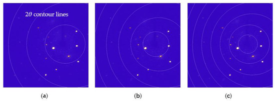 Three typical crystal diffraction images taken from the data collection software, which can be shown in different mode with (a) 3, (b) 5, (c) 7 concentric circles for convenient CIR processing. The white circle lines are the indicators of 2θ contour lines.