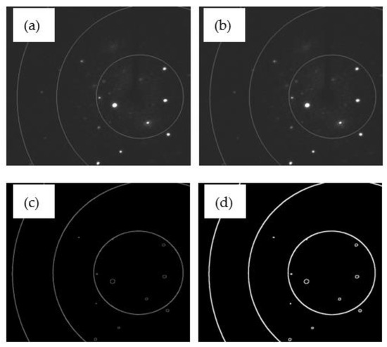 Based on this, we converted the colored images into grayscale image for the recognition processing. A typical colorful diffraction image converted to a grayscale image is shown in Figure 5a. Filtering processing is necessary to remove the noise from the background and to smooth the image. The simple average denoising principle is simple, but easy to fuzzy border after the noise reduction, and so it cannot be widely applied in image pre-processing [9]. In this work, Gaussian filtering was used for image pre-processing. The value of each pixel in the image was obtained by comparison between their weighted averaging value and the neighborhood pixel values. After the Gaussian filtering, the diffraction area was successfully extracted from the background, as shown in Figure 5b. The Canny algorithm is one of the most commonly-used methods for edge detection based on Gaussian filtering [10]. The Canny algorithm traverses the pixel points in the image, removes all non-edge points according to the gradient, and applies double thresholds to determine the edge points [11]. Canny algorithm was employed for the diffraction area edge detection, and the result is shown in Figure 5c. Next, the edge features of the pixels were dilated to highlight them for the subsequent extraction of diffraction area profiles [12]. The convolution kernel used in the dilation processing was based on a 3 × 3 matrix with the iteration number of 1. The diffraction image after the edge dilated treatment is shown in Figure 5d.