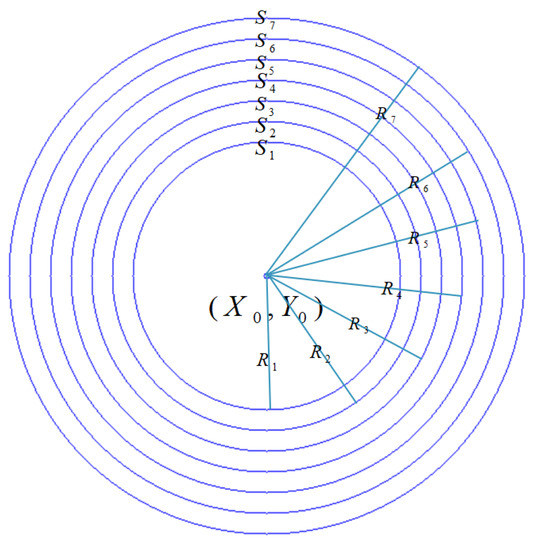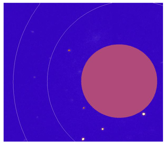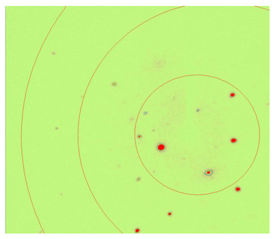 Based on the series of ROI treatment, the Density model was required to divide the diffraction image into different circle zones to compare the Density difference and to calculate the DCDP. Firstly, the coordinate of the center of the ROI image was determined as the center of the model. Next, seven concentric circles with the center were drawn to find the best Density result, as shown in Figure 10. The size of the diffraction image selected in this work was fixed at 1024 pixels × 1024 pixels, which was desired to handle and was convenient to observe and store. Each circle line was tested to find the optional result for Density calculation, since the discrimination effect could not be well shown using the circled area if too large or too small. If the area of the ring is too small, the diffraction image of the crystal in some volumes will have no diffraction spots within the ring, while the area of the ring is too large, the ring will exceed the image range. After the many-time test, the smallest circle with 130 pixels in radius, while the largest circle with 250 pixels in radius was chosen with the ring spacing was 20 pixels because this was the best reasonable choice for the zone dividing. The distance between each diffraction point and the diffraction center was calculated by Equation (1):