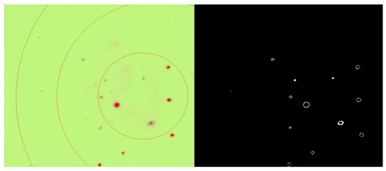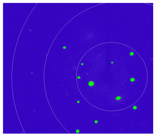 After the image was segmented by the color segmentation method, only the information of the diffraction points was left in the image, as shown in Figure 8. In addition, the image preprocessing operations such as filtering, edge processing, and expansion processing were performed on the image. After that, the diffraction part of the image was extracted by the Findcontours function. After the contour was found, the Drawcontours function was used to draw the contour and to fill the interior. The green color was selected to be drawn and displayed in the source image. All the image processing related functions are referred to the OpenCV library (https://opencv.org/) (accessed on 1 January 2022). The contoured result of a diffraction image is shown in Figure 9. In the Findcontours method, the input image is usually a binary image processed by an edge detection algorithm, and the detected contour is represented as a point vector [18]. A contour is composed of a set of continuous point vectors. There are four retrieval modes to find the contours. The mode adopted in this work was to detect only the outermost contours, ignoring the inner contours contained in the outer contours. Based on this vision effect, the center coordinates of each diffraction zone were calculated and recorded as (Xi, Yi) (i = 1, 2, 3, …). Meanwhile, the area of each diffraction point was calculated, and the results were recorded as Sj (j = 1, 2, 3, …). After that, all the diffraction zones on the image were precisely located by coordination.