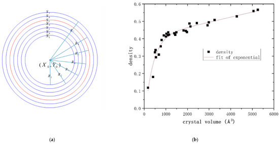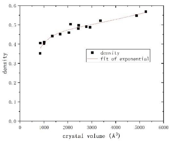 In this work, CIR on about 10,000 diffraction images from 30 crystal samples was performed. Based on the CIR results, there is a functional correlation between the seven densities and the lattice volumes. The Origin software was used to perform the linear fitting on their relationships, and the R-squared was compared to judge the fitting effect. In the fitting results, D5 had the best correlation for fitting the selected lattice volumes since its R-squared value is the closest to 1, and its Density model is shown in Figure 11a. In order to optimize the fitting effect, various function models in the Origin software were used to fit D5, and the R-squared value were compared to evaluate the fitting effect. The results show that the R-squared value obtained by exponential fitting using the ExpDec2 function is the largest, which means the fitting effect is the best. Therefore, this function was selected as the final fitting function. The relationship between the lattice volume and the DCDP by D5 correlation was drawn in Figure 11b. As can be seen, the experimental lattice data and the Density values for the crystal samples showed a nonlinear relationship from 174 to 5256 Å3. After careful calculation and simulation, the relationship between the Density and lattice volume was established by exponential fitting treatment as follows: