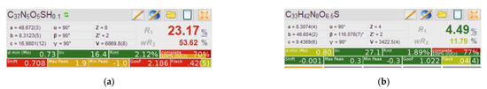 As mentioned in the introduction section, the CIR method can help the users for solving the crystal structures. Herein, we introduced a typical example of a crystal sample W1 (C33H42N8O6S1) with a higher quality. The software provided a lattice volume of 6831 Å3 with an orthorhombic system (a ≠ b ≠ c, a = 48.672, b = 8.3123, c = 16.9801, α = β = γ =90°) after the complete data collection. All the measurement parameters seemed good, as they were located in reasonable ranges with an indexation value of 76%. An axis of the lattice was 48.64 Å3 that was a longer axis for a smaller molecular. The whole data collection time was 2 h. After the experiment, the original data were manually reduced with Laue group as Ammm, completeness of 99.7%, Signal/noise of 21.53, Rint of 0.038, and Rsigma of 0.034. All the key parameters were ideal. However, the crystal structure of this sample was solved by ShelXT but could not be completely refined by ShelXL using Least Squares minimization to convergence since several key parameters such as R1 and wR2 were too high in this default lattice (Figure 13a). It was worthwhile to reconsider the original data of the lattice parameters were correct or not. After multiple attempts for solving this problem, it was still difficult to be addressed. The users then introduced the CIR method to rejudge the lattice parameters based on the linear relationship mentioned above. A new lattice volume location range (3000~4000 Å3) was provided by the CIR suggestion. The platon software confirmed the presence of a lattice volume of V = 3435 Å3. Next, the users recollected the diffraction data and, in this time, we manually set new lattice parameters with a = 8.3, b = 48.6, c = 9.4, α = γ =90°, β = 116°, since the program could not provide the option for this lattice parameter. In this case, a new crystal system of monoclinic (space group of P21) and a new cell volume of 3422 Å3 were obtained. After 7 h of collection time, a new set of diffraction data was collected. This time, the crystal structure was successfully solved and refined based on the new data with excellent key parameters thanks to the CIR assistance (Figure 13b).