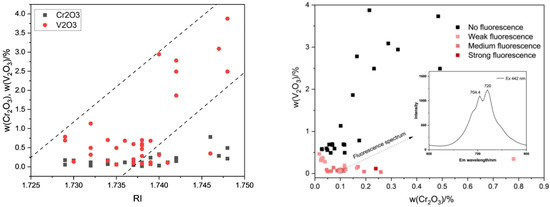 We observe that the refractive index (RI) shows a moderate increasing trend with w(V2O3)/% values (Figure 2 on the left); the relationship is not very linear because the samples belong to the same class of garnets and the refractive indices are therefore very close (between 1.73 and 1.75). An anomalous point with a higher refractive index (1.746) but with a very low V content is noted, while the neighboring samples all have a high V content; this anomaly can be explained by the fact that the sample has a high Cr content, which also influences the index. The refractive index of gemstones is determined by the polarizability of ions in the crystal. The cationic polarizability depends on the ion radius and the structure of the outer electron layer. The greater the radius of cations with the same atomic valence, the higher the polarizability [20]. When vanadium ions replace aluminum ions, the polarizability increases, so the refractive index increases. The refractive index shows a slight positive correlation with the chromium content; the correlation is less evident than that with V3+ because the Cr3+ content is lower, and its polarizability is also lower than that of V3+ [20].