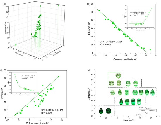 (a) 35 tsavorites plotted in CIE 1976 L*a*b*uniform color space; (b) correlation between color coordinate a* with chroma C* and hue h°; (c) correlation between color coordinate b* with chroma C* and h°; (d) tsavorites’ color grading is divided into: deep, vivid, intense, fancy, light, faint.