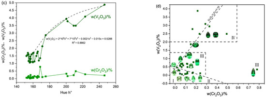 We believe that by checking the Cr and V contents we can obtain the samples with the best gemological properties, which are those in region III (Figure 4d). We cannot partition the rich Cr zone because we lack the Cr-rich samples. When making synthetic gemstones, if you want a vivid green color, you can refer to the Cr and V contents of area III, while if you want a fresh mint green color, you can refer to the Cr and V contents in area II. Instead, we should avoid the compositions of areas I and IV, as the samples here are too light or too dark.