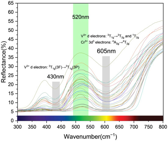 The A, B, C, D, E, and F absorption peaks are related to the relevant vibration inside the [SiO4]4− group. The G, H, and I absorption peaks are generated by lattice vibration, that is, the vibration of other cations except Si ions. A. M Hofmeister et al. [33] believe that the absorption peak in the range of 400–500 cm−1 is formed by the motion of trivalent cations entering the [BO6] lattice (Table 3). In this paper, the trivalent cations are mainly Cr3+ and V3+. In order to study the effect of chromogenic elements on infrared spectra, we focus on the change of G, H, and I peaks. Since V plays a major role in defining color (when present in high levels), we first studied the influence of this element on the infrared spectrum. By selecting seven samples with increasing content of V, we observe that with decreasing content of this element, the G, H, and I peaks shift in the direction of increasing wavelength.