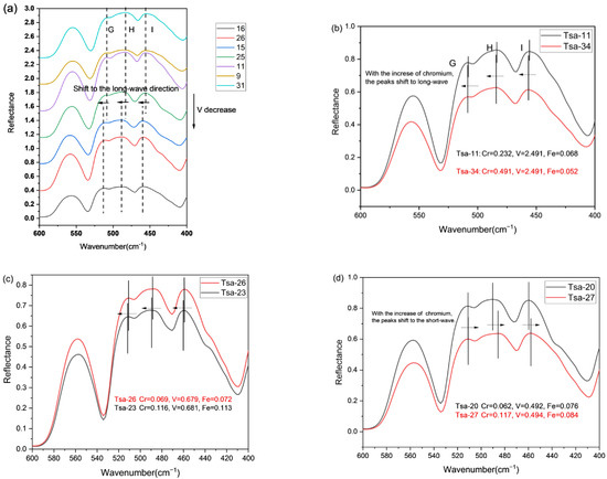 Then, by selecting samples with the same amount of V, we can observe the influence of Cr on the infrared spectrum, but the influence of Cr does not follow the same unified law with V (Figure 9b–d). Most cases show that with the increase of Cr, some peaks in G, H, and I move in the direction of increasing wavelength, but one case moves significantly differently in the direction of decreasing wave number (Tsa-20 and Tsa-27). It may be that the measurement of XRF data is not accurate enough to accurately reflect the slight change of content.