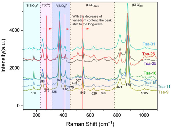 The peaks at 275 cm−1, 412 cm−1 and 545 cm−1 tend to move towards the direction of decreasing wavelength with the increase of the V element (Figure 10). That is, the Raman shift attributed to Si-OBend shifts to the short-wave direction with the increase of the B3+ ion radius, indicating that with the increase of the B3+ ion, [BO6] the octahedron also increases accordingly, which reduces the bond energy of the Si-O chain connected with it, resulting in the short-wave direction shift of Raman shift attributed to Si-OBend. The other two shifts are also due to the decrease of bond energy.