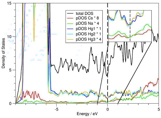 From DFT calculations, information on the polarity of the bonding inside amalgams in the sense of high Coulombic contributions to the metallic bonding cannot directly be derived. However, there exist several typical indications for a disturbance of the conduction electrons by strong local electric fields caused by ionic bonding contributions. The DOS and pDOS plots are shown in Figure 4. The individual pDOS curves are multiplied, taking into account the respective site multiplicities. At the Fermi level, the density of states has a pronounced local minimum, yet it is non-zero. This is one of the characteristic features of a metal with a relatively low charge carrier concentration. The partial densities of states for the alkali metals is also non-zero, however, with a pronounced minimum at the Fermi level. This can be interpreted as partial electron transfer, resulting in partially positively charged atoms in the sense of Cs(Na)[Hg]. As the local minima in the pDOS of Na and Cs are not very pronounced, one can assume , the overall polarity, to not be very large. The respective partial negative charge is distributed rather evenly over all atomic sites of the Hg lattice, according to the calculated Bader charges (see Table 6). The differences in charge distribution (Hg3 has a slightly lower partial charge than Hg1 and Hg2) may be the result of longer Hg3–Na contacts (see Table 5). The electron density on the bond critical points is very low for the Hg–Na and Hg–Cs contacts and significantly higher for the Hg–Hg contacts, indicating ionic Hg–alkali metal and covalent Hg–Hg interactions. The rather uniform electron density distribution amongst Hg atoms can be seen not only in the Bader charges but also in the very similar pDOS curves in the region around E for all three crystallographically different Hg sites. Another typical feature in the DOS curves of Hg-rich amalgams with high polarity is the broad range of energy over which d, s and p-states are spread. This mixing is common for systems with predominantly covalent Hg–Hg interactions.