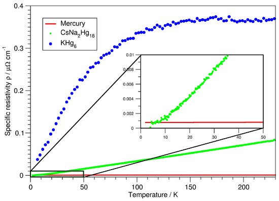 The specific resistivity of CsNaHg is shown in Figure 5 and reflects the macroscopic aspects of the electronic situation. The ‘bad metal behaviour’ [58], consisting of high specific resistivity with steep temperature dependence, is present. However, a typical deviation from the linear temperature dependence and a low Ioffe–Regel limit [59] cannot be discerned up to room temperature. For comparison, the specific resistivities of elemental Hg and the amalgam KHg [44] with an equal A:Hg ratio are shown. From the band structure calculations, a relatively small polarity was seen, and the lower extent of ‘bad metal behaviour’ visible in the specific resistivity plot corroborates this finding. From direct comparisons, it can be assumed that parameters additional to the Hg content of an amalgam contribute to the macroscopic physical behaviour, such as phononic contributions, structural complexity or defects.