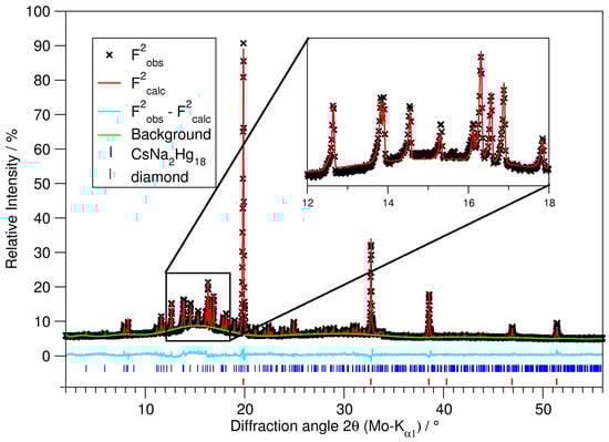 For powder diffractometry, representative parts of the product of an optimised synthesis were ground in an agate mortar inside an argon-filled glove box. In order to obtain fine powder from the slightly ductile sample, diamond powder (Sigma Aldrich, synthetic monocrystalline powder, <1 m, dried by heating in vacuum) was added in an approximate volume ratio of amalgam:diamond = 1:20. The powder then was melt-sealed in thin-walled glass capillaries (Spezialglas No. 10, Hilgenberg, Malsfeld, Germany, ⌀ = 0.5 mm) and mounted and centred on the goniometer of a Stadi P diffractometer system (Stoe & Cie, Darmstadt, Germany, equipped with Mo-K1 radiation, curved Ge monochromator and a MYTHEN 2K strip detector, Dectris, Baden-Dättwil, Switzerland). Data collection was performed in parafocusing Debye–Scherrer geometry. Multiple ranges were collected successively and added afterwards in order to optimise the signal-to-noise ratio. The powder diffraction pattern was used for a Rietveld refinement; see Figure 6 and Table 7. The refinement was performed with the program package Topas [60], taking the single crystal structure model as the starting value. The background was modeled by a shifted Chebyshev function with 20 parameters; the profiles were modeled based on instrument and sample parameters (fundamental parameter approach).