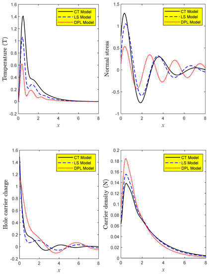 The distributions of the main real dimensionless fields along the axial direction at a short moment are shown in the first group depicted in Figure 1. In order to describe the non-local photo-thermoelasticity models under the influence of a strong magnetic field and the Hall current effect, comparisons are made based on the variation of thermal relaxation times. With the help of the first subfigure, which depicts the isothermal condition that prevails at the non-local silicon medium’s outer surface, it is possible to study the dimensionless temperature distributions. The first subfigure shows how photo-thermal excitation and strong magnetic field pressure cause the dimensionless thermal wave values to start at their minimum value near the edge of the medium, and then increase with increasing distance until they approach the maximum value before decreasing gradually. On the other hand, the thermal wave propagates exponentially to approach zero inside the medium to reach the equilibrium state. The second subfigure shows the distributions of the dimensionless mechanical force or normal stress (mechanical wave) throughout the axial distance. The mechanical wave distributions meet the mechanical ramp-type requirement, which begins at a positive value on the edge of the non-local medium and progressively rises to a maximum value close to the surface (due to the pressure force of a strong magnetic field or Hall current). The mechanical wave progressively diminishes as it gets further from the outside surface, then increases and declines smoothly again as it approaches the zero line and seeks to attain equilibrium. The third subfigure shows how the thermal and elastic relaxation times affect the distributions of dimensionless hole carrier charges throughout the axial distance. The hole carrier charge distributions start from positive maximum values at the boundary edge of the non-local medium with a fast decrease to approach the minimum value during the processes of holes and plasma recombination. However, in the second range, the hole carrier charge distributions inside the material approach the stable situation for a brief period of time (as a result of the lack of excited electrons inside the material) before decreasing and becoming convergent to the zero line. According to the plasma recombination processes, the carrier density that represents the plasma waves (electron charge field distribution) starts from a positive value at the edge, as seen in the fourth subfigure. The optical-thermal energy and Hall current cause plasma waves to steadily increase towards the surface until they reach their maximum values. After briefly resting within the non-local semiconductor medium, they then begin to gradually decrease. In order to achieve stability, the plasma waves eventually start to get closer to the zero line. It adopts an exponentially significant behavior that is in line with the findings of the experiment.