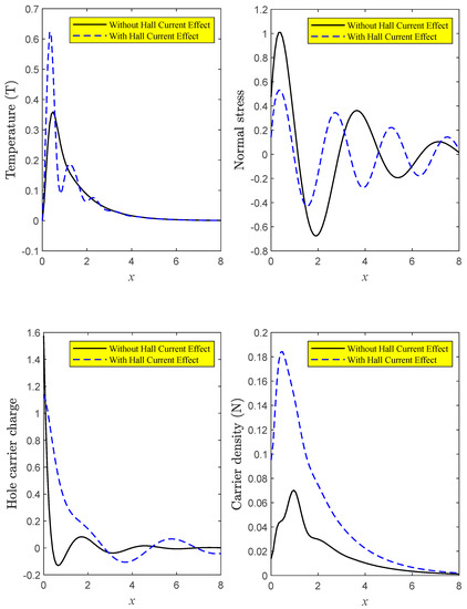 The second group (Figure 2) shows how the principal fields (, and distributions) are affected by a strong magnetic field with a Hall current effect as a function of axial distance . Two alternatives are investigated in this group using the DPL model for silicon non-local semiconductor material for small-time . When the Hartmann number (the strength of magnetic pressure) has a value, the first example depicts the distribution of magnetic fields in the presence of the Hall current. The other depicts how physical fields are distributed when no significant magnetic field or Hall current are present. A cloud of surface electrons is created as a result of violent collisions between internal particles within the semiconductor medium caused by optical excitation and the compressive intensity of the strong magnetic field with the Hall current (plasma). This case deviates from the case of no magnetic excitation in terms of how all physical quantities propagate as waves. However, the inner particles (with the spin movement of particles) in the non-local semiconductor lattice are rearranged when a strong magnetic field with the Hall current is present. Increased holes and free electrons on the semiconductor’s outer surface as a result of the Hall current boost the flow of the electric current inside the semiconductor.