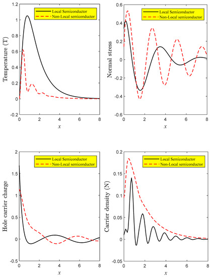 The third group (Figure 3) illustrates how a non-local parameter affects the main quantities (, and distributions) as a function of axial distance . This group uses the DPL model to examine two possibilities while taking the influence of the Hall current for small-time . The first example shows the non-locality semiconductor distribution when the non-local parameter () has a value. The other illustrates the distribution of physical fields in the absence of a significant non-local parameter (local, ). From this group, it can be seen that all the field quantities under study exhibit a rise in non-locality. The temperature field is the lone exception. When compared to other distributions, the significance of the profile non-locality in temperature reduces. The non-locality remarkably influences all distributions. All physical fields are significantly impacted by non-locality. This is most likely caused by the following mechanism: to characterize the non-local effect on the distribution of the field variables of interest, the photo-elastic non-locality was introduced directly into the equation of motion and the constitutive equations rather than the heat conduction equation, as shown in the figures.